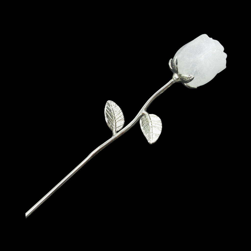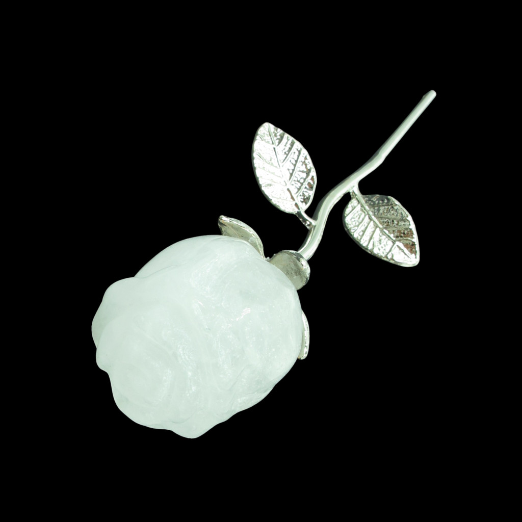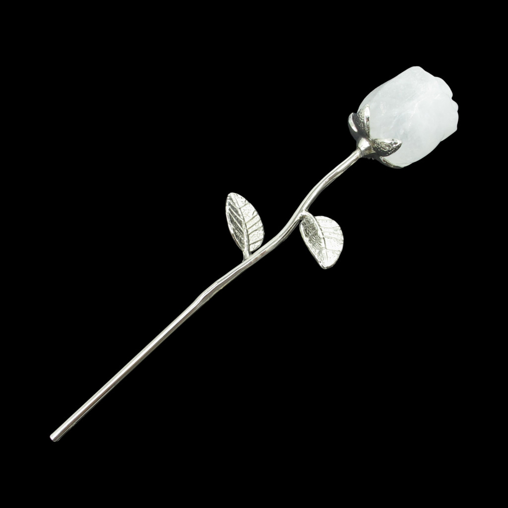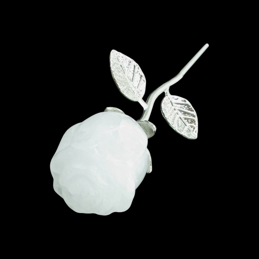 Ez a különleges ajándéktárgy természetes hegyikristályból finoman kifaragott rózsa, elegáns fém szárral és levéllel kiegészítve.