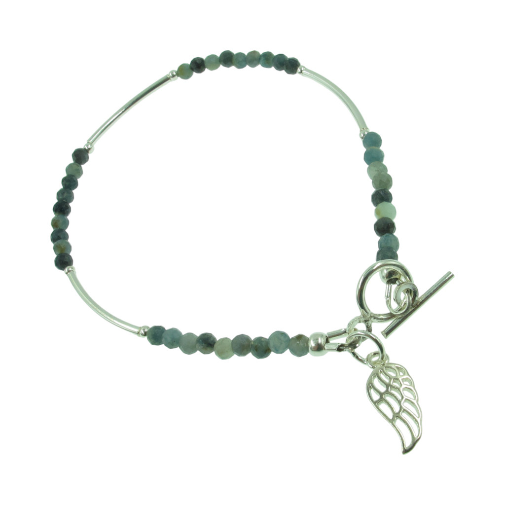 Ritka kék turmalin karkötő ezüst kiegészítőkkel, angyalszárny charm-mal